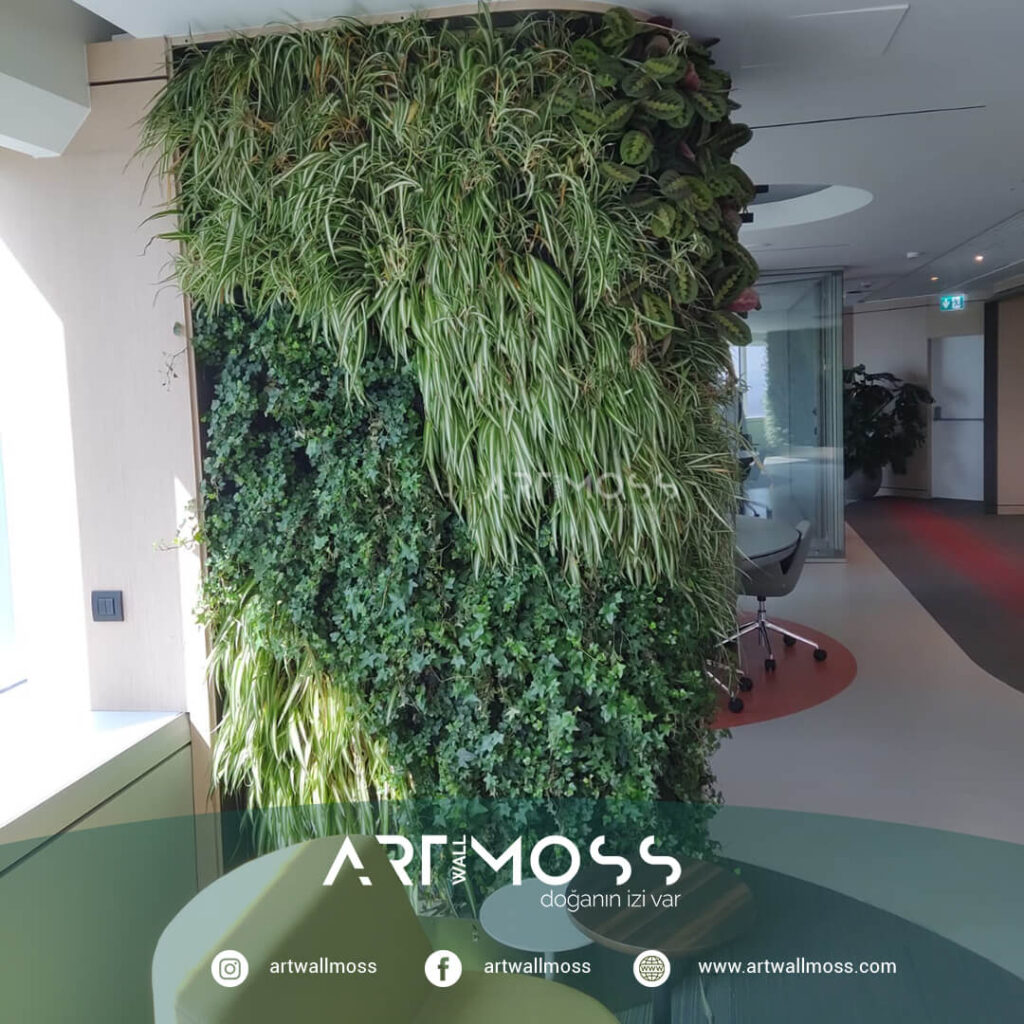 Dikey bahçelerde tercih edilen bitkiler, ışık, nem ve bakım ihtiyacına göre seçilir. Dayanıklı, kök sistemi güçlü ve dekoratif bitkiler tercih edilir. En sık kullanılan türler arasında Sarmaşık (Hedera helix), Kurdele çiçeği (Chlorophytum), Paşa kılıcı (Sansevieria), Dua çiçeği (Maranta), Telgraf çiçeği (Tradescantia) ve Aşk merdiveni (Nephrolepis) gibi bitkiler yer alır. İç mekanlarda düşük ışıkta gelişebilen türler öne çıkar. Art Wall Moss olarak, her proje için mekâna en uygun bitki türlerini özenle seçiyoruz.